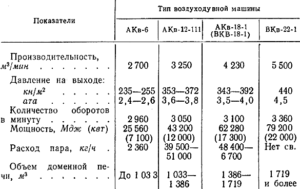 В начале XX в. появились центробежные воздуходувки, работающие от паротурбинного привода (турбовоздуходувки). В одну доменную печь большого объема может вдуваться до 5 млн. м3 воздуха в сутки. Подачу такого количества воздуха может обеспечить только мощная воздуходувка современной конструкции (табл. 13).
