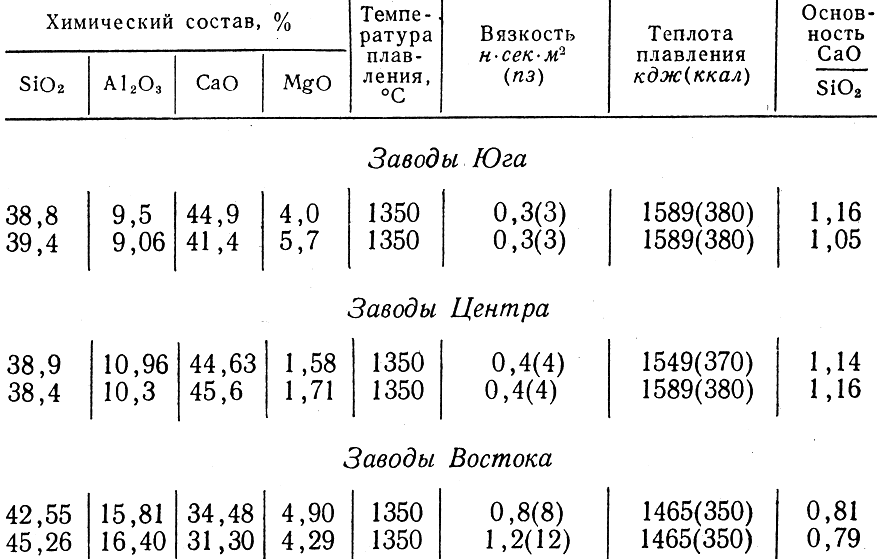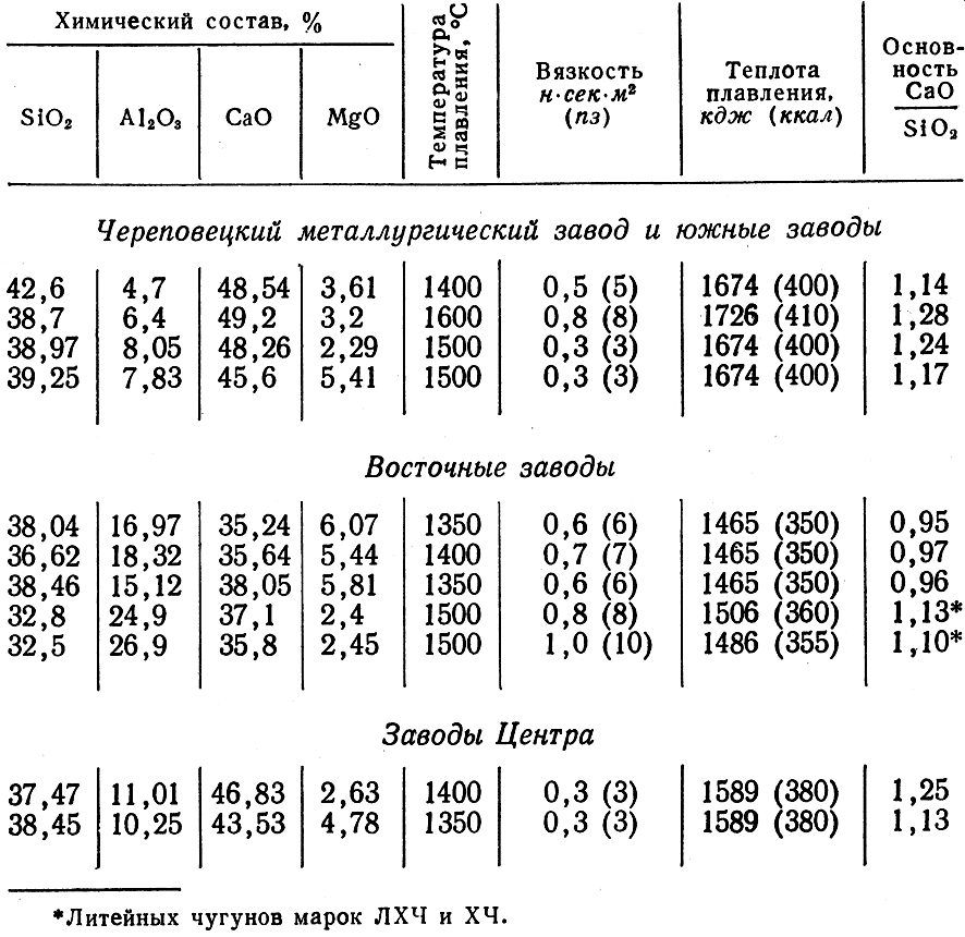 Наилучшими условиями для выплавки литейных чугунов являются: повышенный нагрев печи (особенно горна) и умеренно кислый шлак. Эти условия способствуют восстановлению кремния из кремнийсодержащих соединений. Из практики работы заводов известно, что хорошие результаты плавки получаются при основности шлака СаО: SiО2 = 0,95 - 0,97 для восточных заводов и 1,1 - 1,20 для заводов Юга. В табл. 21 приведены характеристики шлаков литейных чугунов.