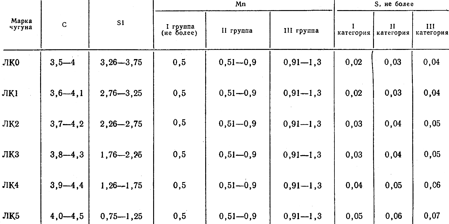 Легированные литейные чугуны выплавляют четырех марок и двух видов: ЛХЧ1-4, содержащий 2,2 - 3,2% хрома и не менее 1% никеля, и ХЧ1-4, содержащий от 1,61 до 3,8% хрома и 0,6 - 1% никеля.