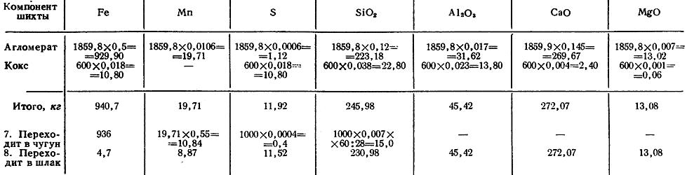 6. Количество составляющих, внесенных агломератом и коксом, подсчитано в табл. 28.