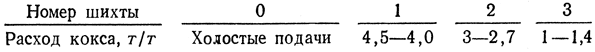 Общее количество подач определяется в зависимости от объема печи и размера подачи. Количество холостых подач принимают равным 40 - 50% от общего количества подач. Шихта, в которой удельный расход кокса составляет 1,4 - 1,5 т/т, остается без изменения до тех пор, пока после задувки не выяснится нагрев печи и ее ход. После этого продолжают увеличивать рудную часть шихты, одновременно корректируя основность шлака и состав чугуна. Как правило, печь задувают на литейный чугун.