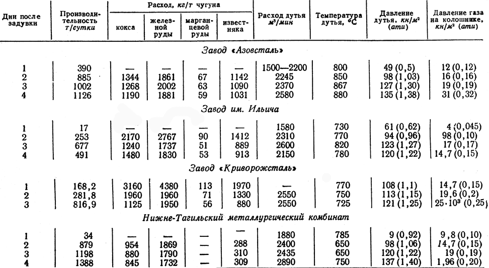 В табл. 32 представлены режим задувки и показатели работы на современной печи большого объема в первые дни после задувки и в раздувочный период.
